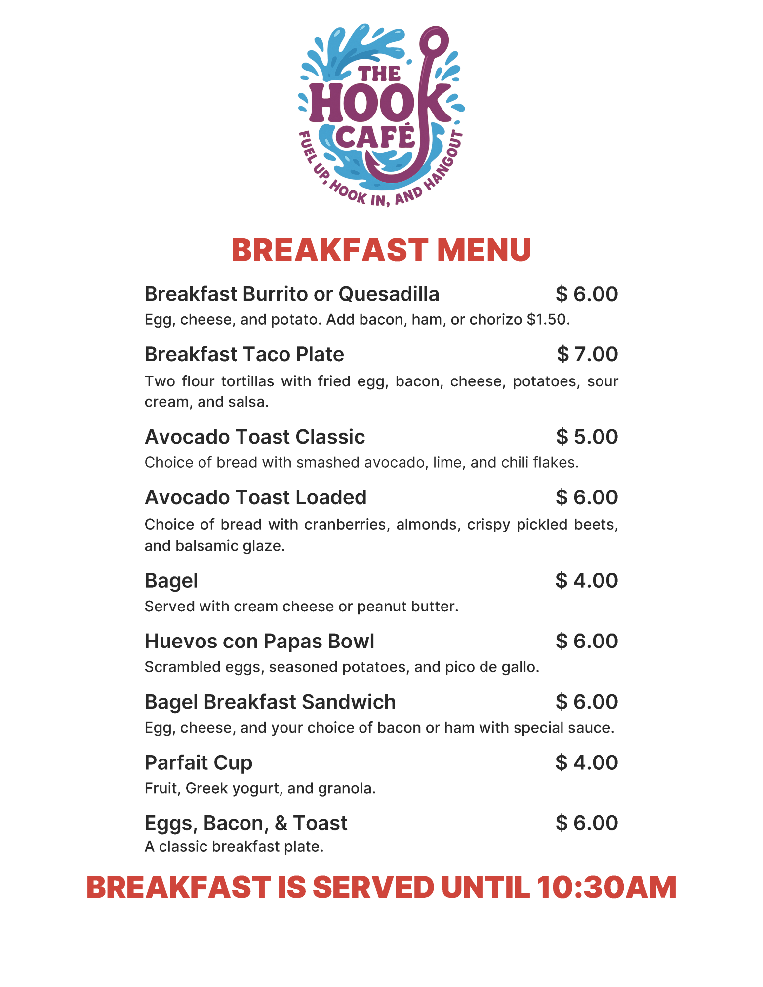 - Monday - Thursday: 8:30 am - 2pm and 3-4pm (food, beverage purchases and ordering services available)