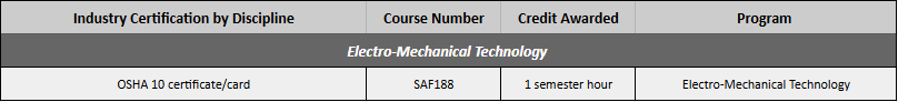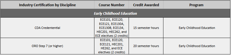 Currently held professional certifications and licensures are accepted by CGCC as articulation for credits in the following courses: